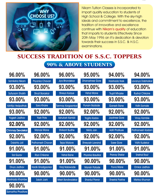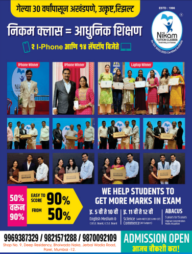 Nikam Tuition classes was incorporated to impart quality education to students of High school & Colleges. With the sky-high ideals and commitment to excellence, the tradition of innovation and excellence continue with Nikam’s quality of education that it imparts to students for last 21 years and its dedication & devotion towards their success in at SSC & HSC examinations.